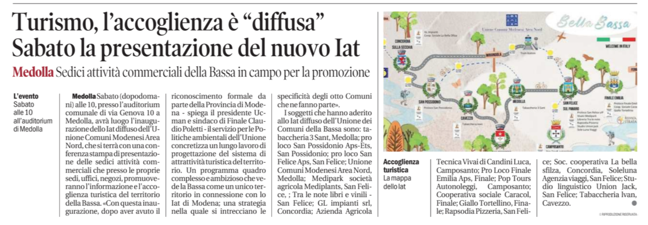 Sabato 11 ottobre alle ore 10.00 presso l'Auditorium di Via Genova 10 a Medolla ci sarà l'inaugurazione dello IAT diffuso dell'Unione Comuni Modenesi Area Nord , progetto a cui abbiamo aderito con piacere per contribuire a promuovere l'informazione e l'accoglienza turistica nel territorio della Bassa Modenese. La presenza della Ciclovia del Sole nel nostro territorio richiama molti turisti di passaggio che da oggi avranno anche a Camposanto un punto di riferimento in più.